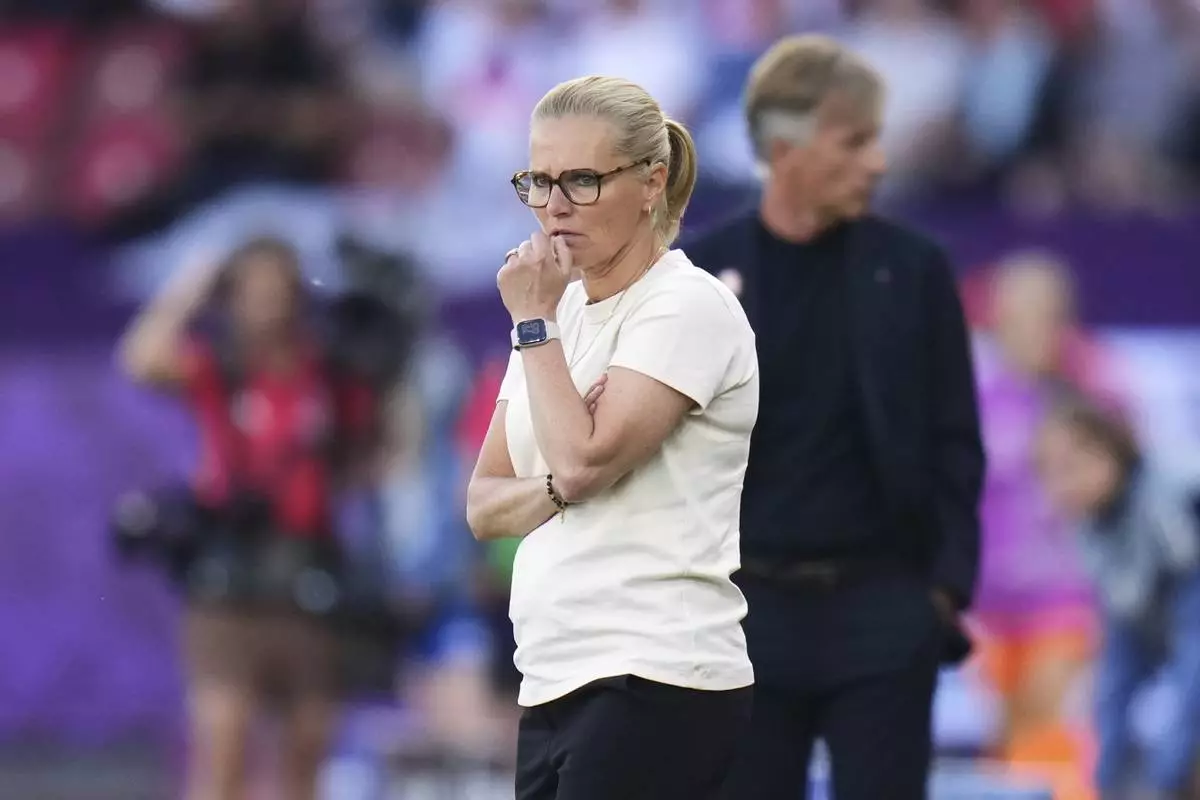 England head coach Sarina Wiegman stands by the touchline during the Euro 2025, group D, soccer match between England and the Netherlands at Stadion Letzigrund in Zurich, Switzerland, Wednesday, July 9, 2025. (AP Photo/Alessandra Tarantino)