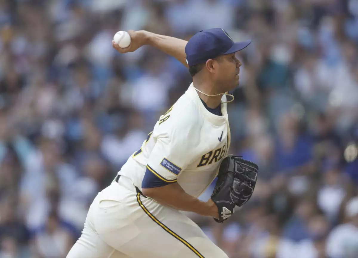Milwaukee Brewers starting pitcher Jose Quintana throws to the Los Angeles Dodgers during the first inning of a baseball game, Wednesday, July 9, 2025, in Milwaukee. (AP Photo/Jeffrey Phelps)