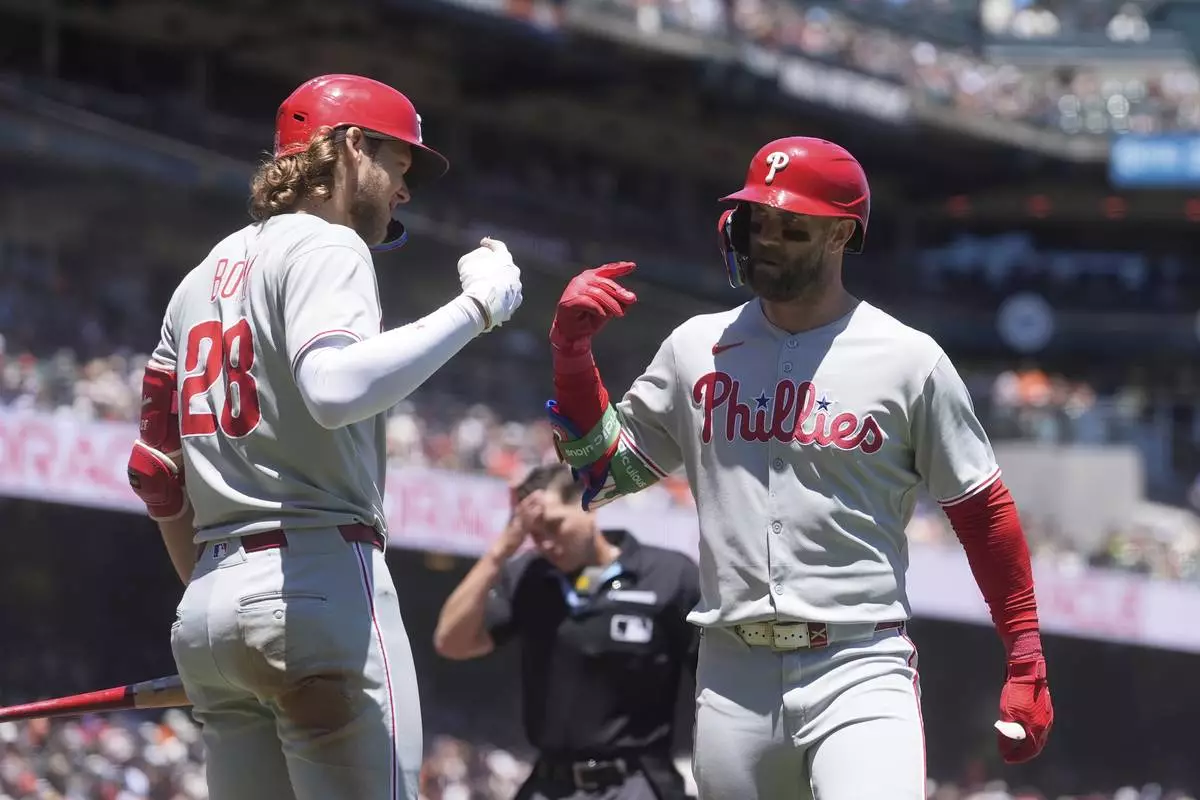 Philadelphia Phillies' Bryce Harper, right, is congratulated by Alec Bohm after hitting a home run against the San Francisco Giants during the fourth inning of a baseball game in San Francisco, Wednesday, July 9, 2025. (AP Photo/Jeff Chiu)