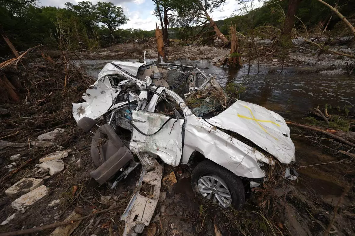 A destroyed vehicle sits next to the Guadalupe River on Wednesday, July 9, 2025, in Hunt, Texas, after a flash flood swept through the area. (AP Photo/Gerald Herbert)