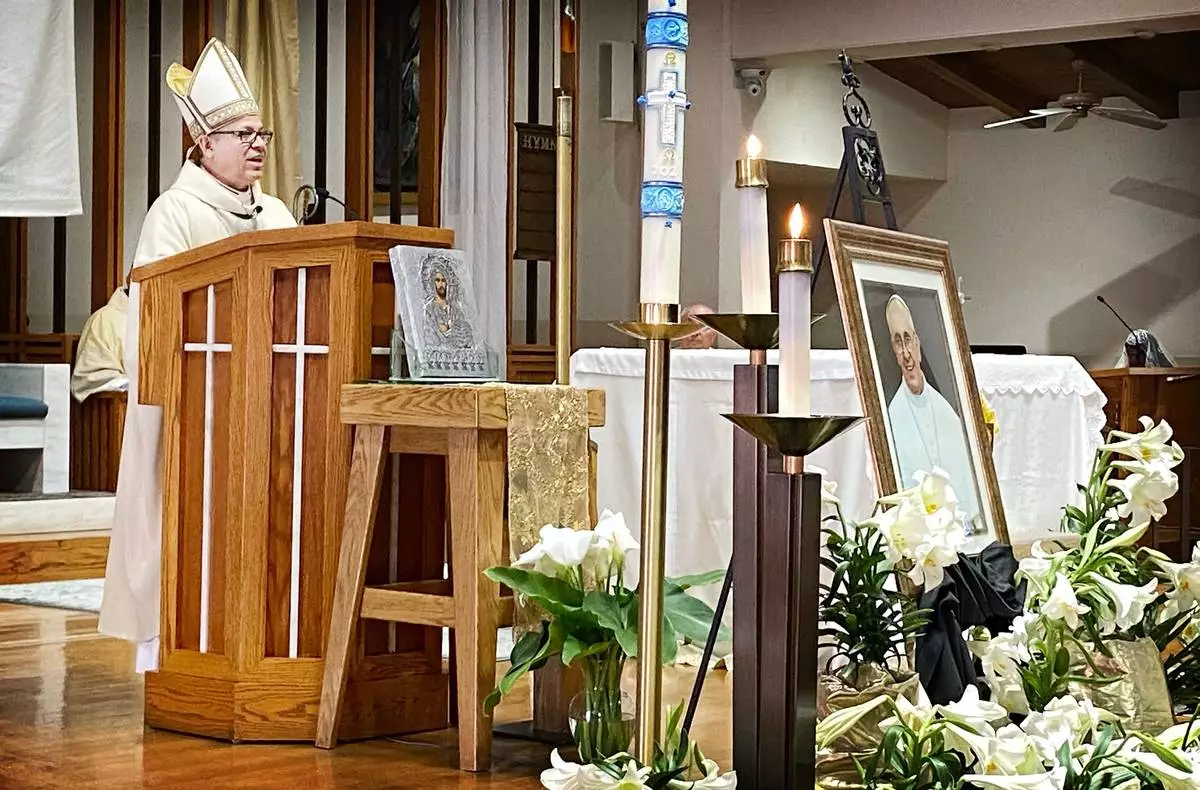 Bishop Alberto Rojas of the Diocese of San Bernardino gives the homily at a memorial Mass for Pope Francis at Our Lady of the Rosary Cathedral, Friday, April 25, 2025, in San Bernardino, Calif. (Terry Pierson/The Orange County Register via AP)