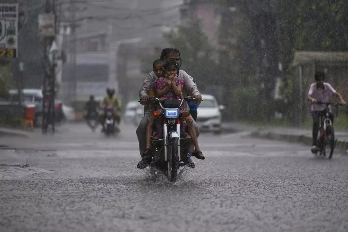 FILE - A motorcyclist with his family drive on a street during heavy rainfall in Rawalpindi, Pakistan, June 27, 2025. (AP Photo/Anjum Naveed, File)