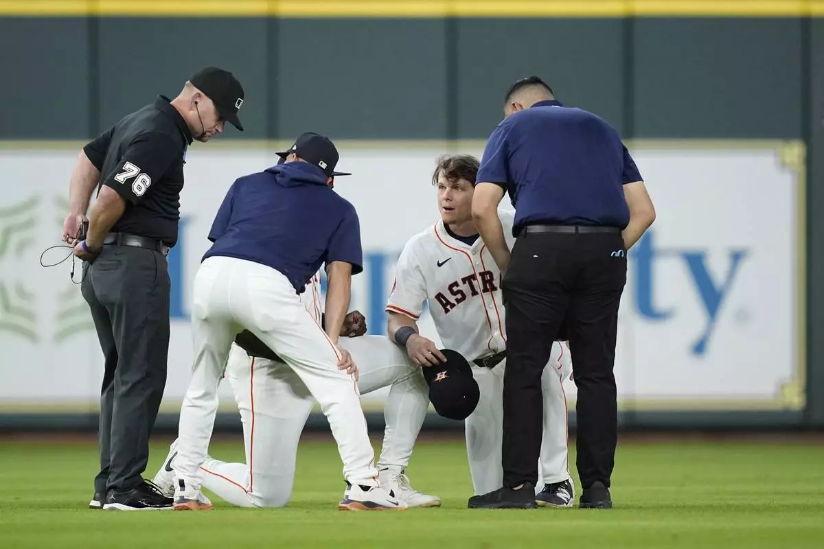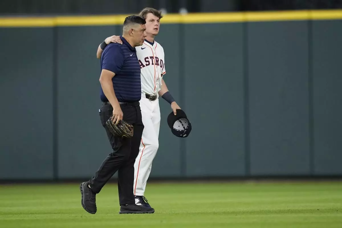 Houston Astros center fielder Jake Meyers, right, is helped off the field before the start of a baseball game against the Cleveland Guardians Wednesday, July 9, 2025, in Houston. (AP Photo/David J. Phillip)