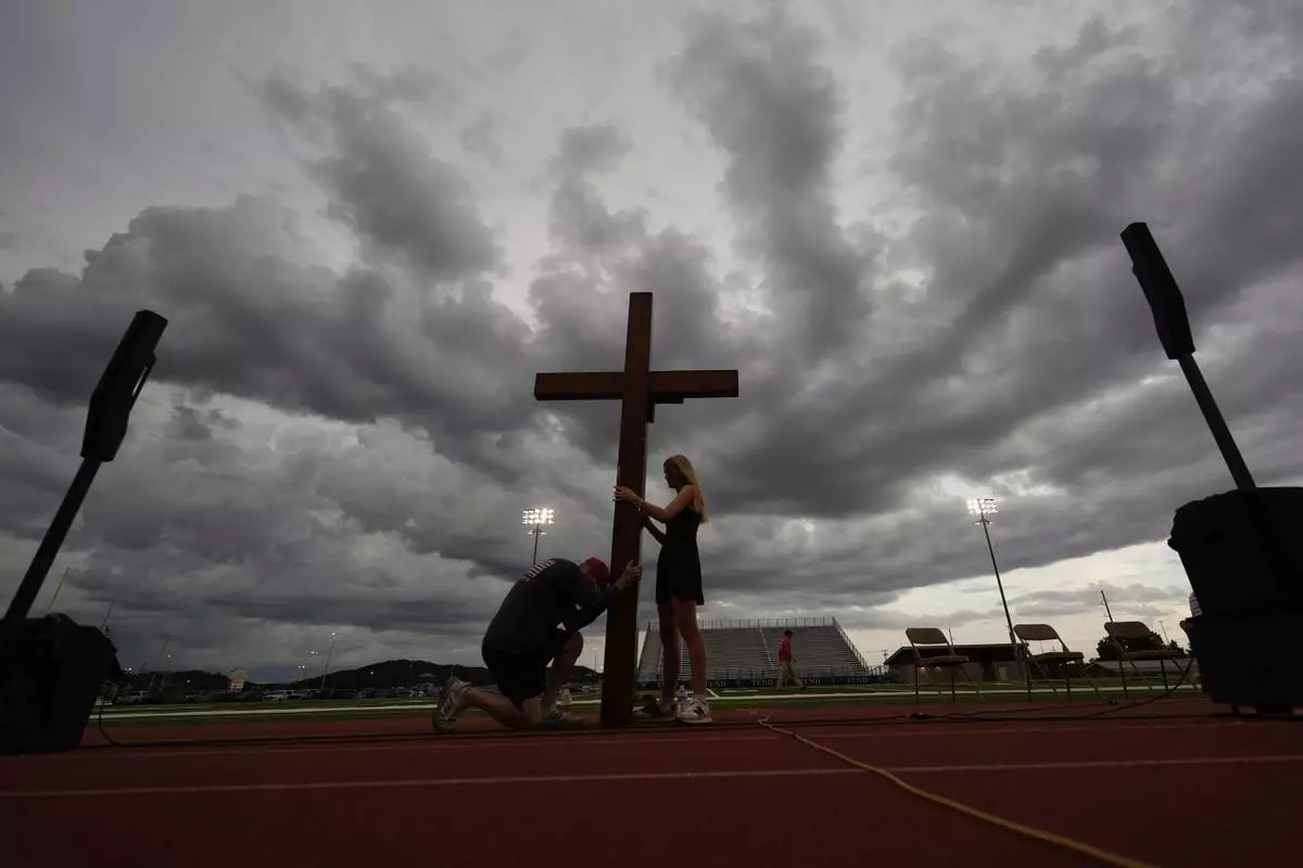 Dan Beazley, of Michigan, left, reacts as he holds a large cross with Abigail Smithson during a vigil for flooding victims at Tivy Antler Stadium on Wednesday, July 9, 2025, in Kerrville, Texas. (AP Photo/Gerald Herbert)
