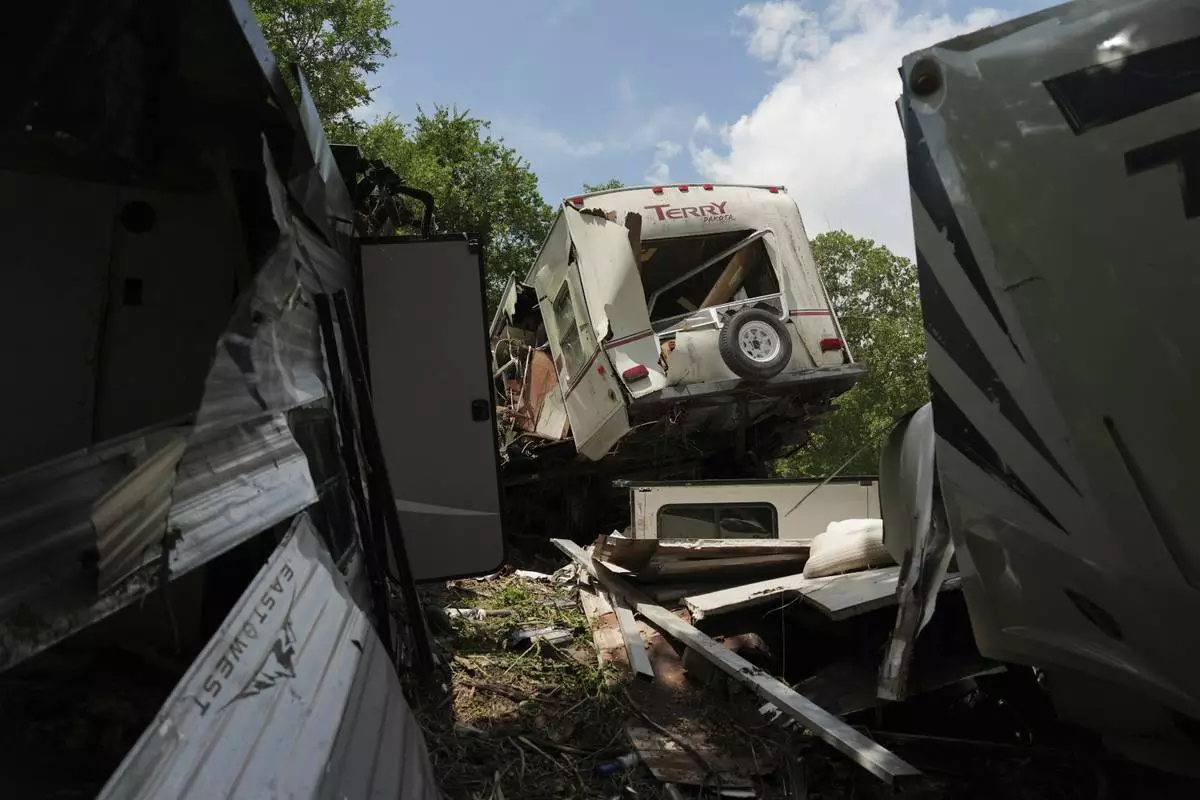 Damage from recent flooding is visible Wednesday, July 9, 2025, at an RV park in Georgetown, Texas. (AP Photo/Joshua A. Bickel)