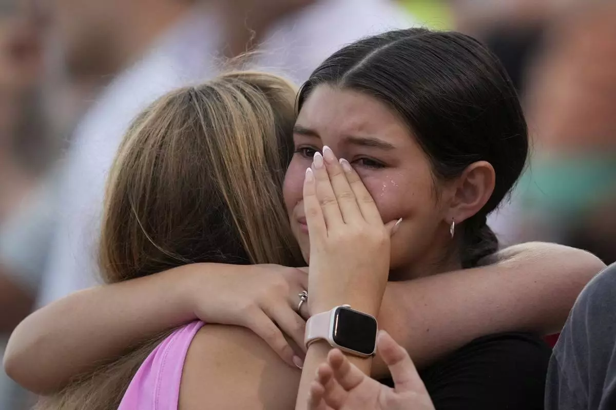 Girls hug during a vigil for flooding victims at Tivy Antler Stadium on Wednesday, July 9, 2025, in Kerrville, Texas. (AP Photo/Ashley Landis)