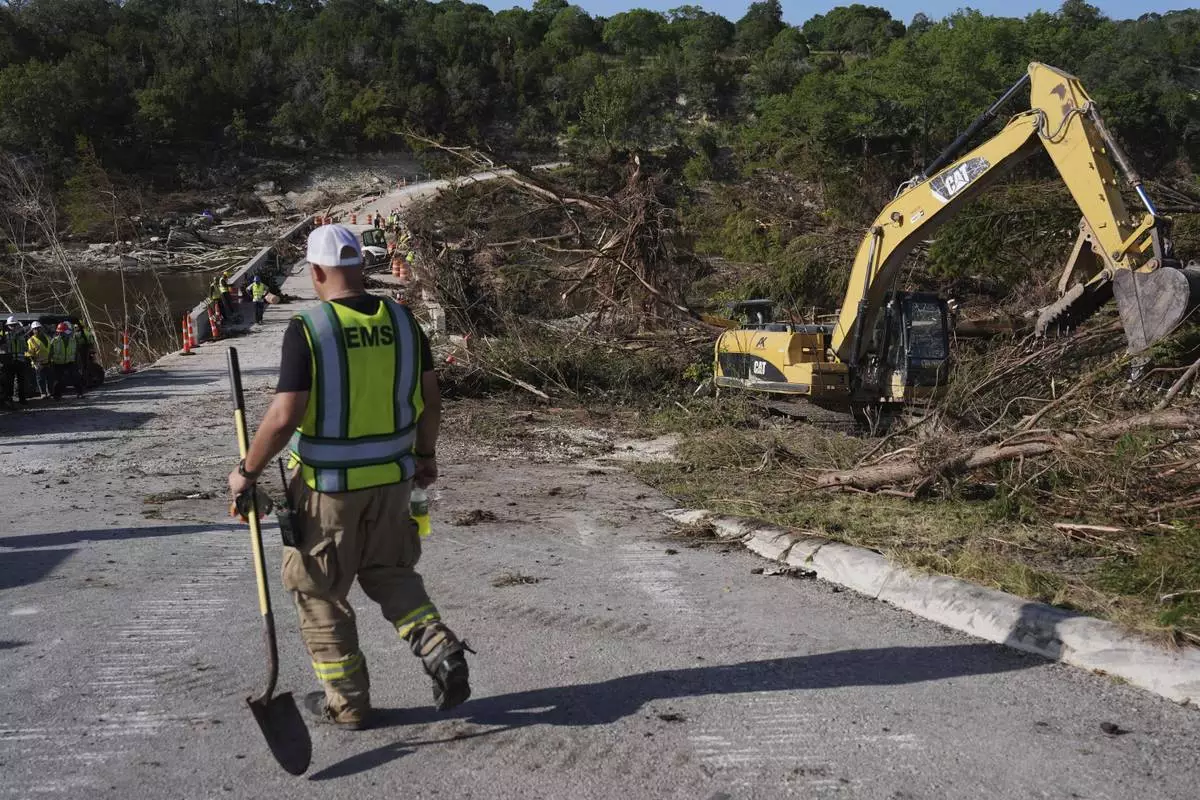 Crews work on the Cade Loop Bridge to clear debris following flooding, Thursday, July 10, 2025, in Ingram, Texas. (AP Photo/Joshua A. Bickel)