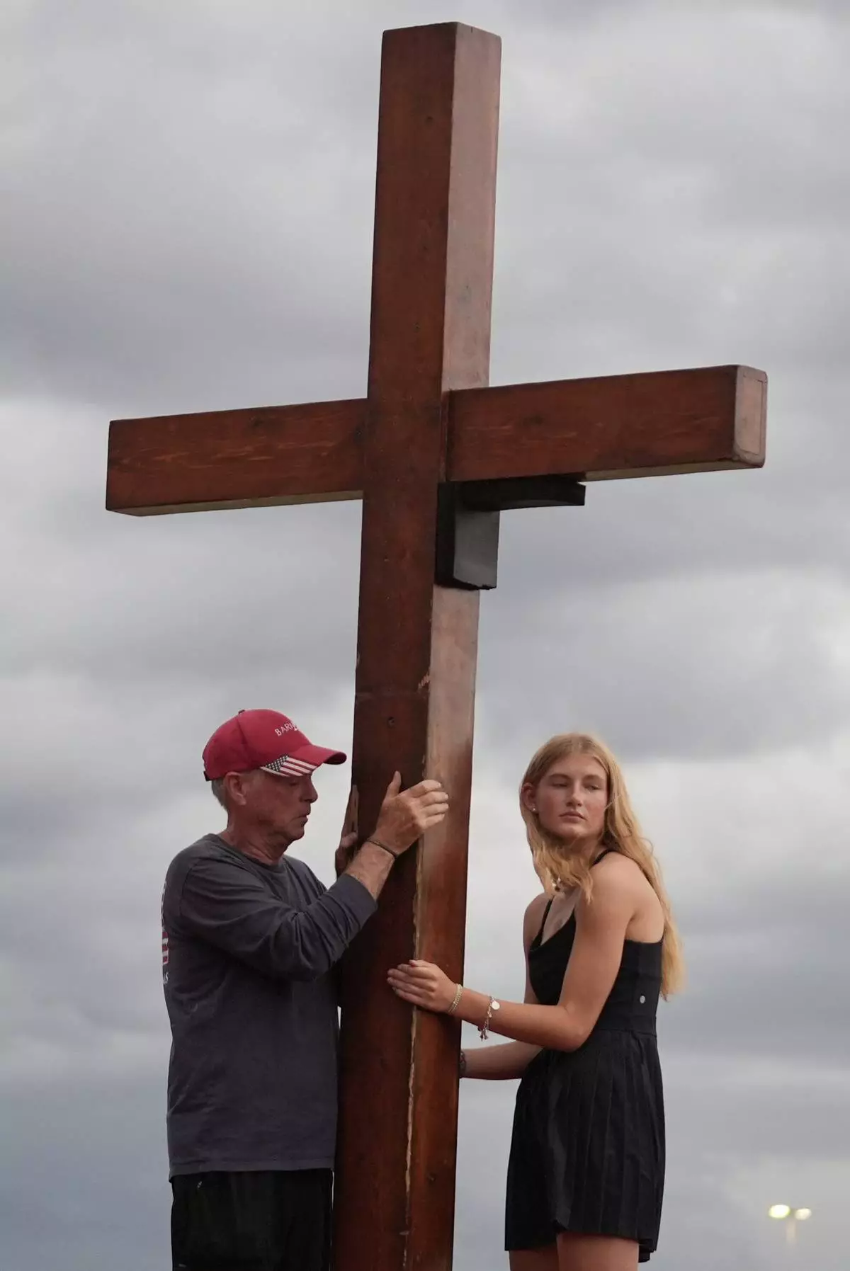 Dan Beazley, of Michigan, left, and Abigail Smithson hold a large cross during a vigil for flooding victims at Tivy Antler Stadium on Wednesday, July 9, 2025, in Kerrville, Texas. (AP Photo/Gerald Herbert)