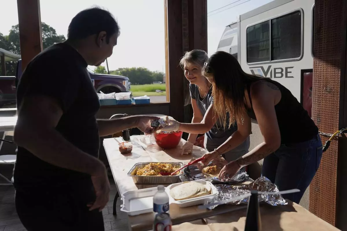 Audrey Ethridge and Briana Virden, right, help feed first responders and volunteers in Comfort, Texas on Thursday, July 10, 2025. (AP Photo/Ashley Landis)