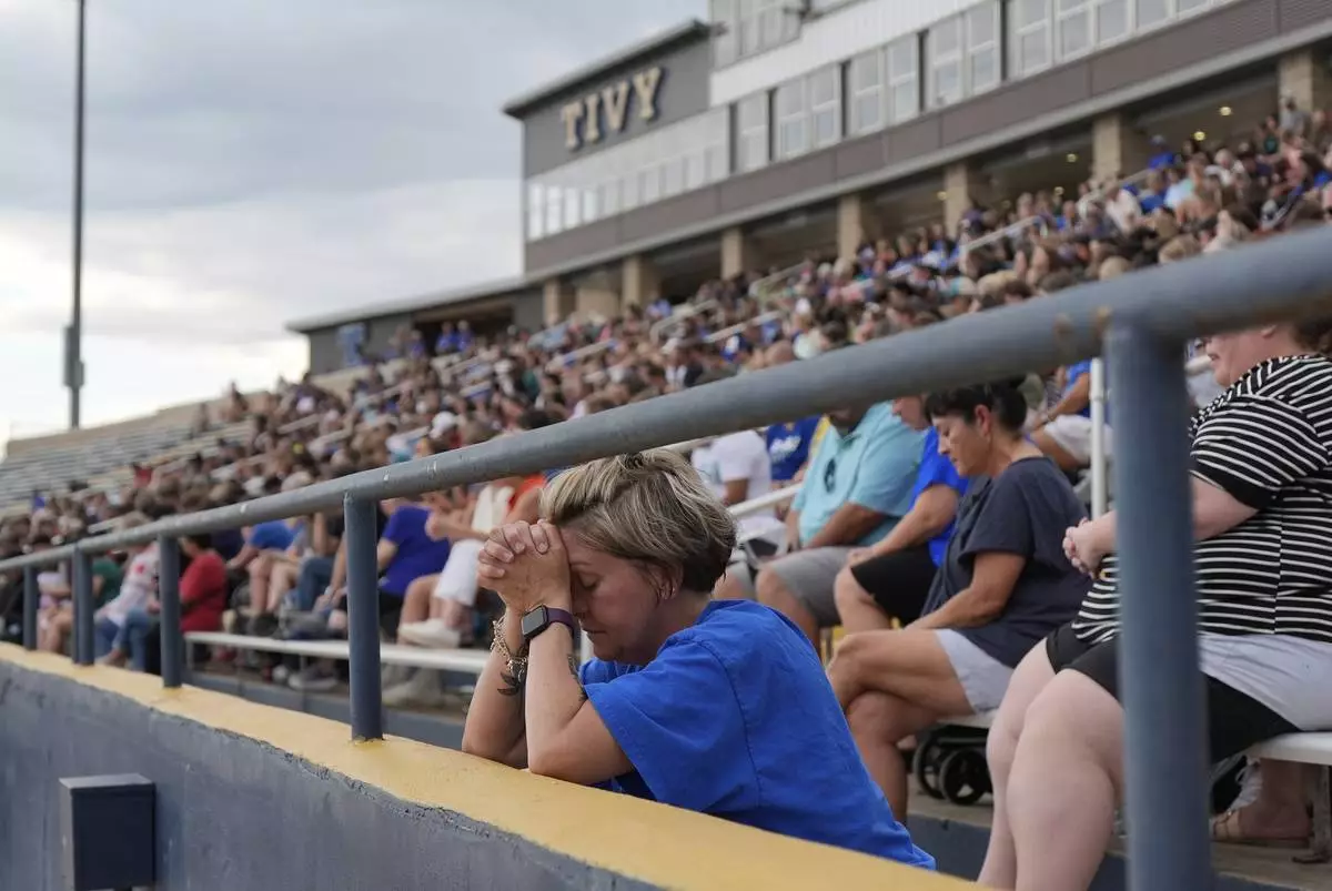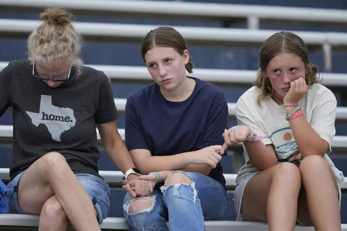 Attendees react during a vigil for flooding victims at Tivy Antler Stadium on Wednesday, July 9, 2025, in Kerrville, Texas. (AP Photo/Gerald Herbert)