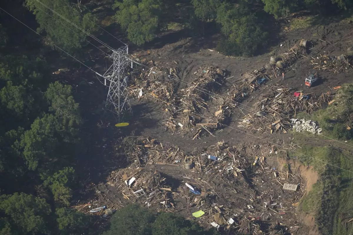 This aerial photo shows debris covering the ground in Hunt, Texas on Thursday, July 10, 2025. (AP Photo/Gerald Herbert)