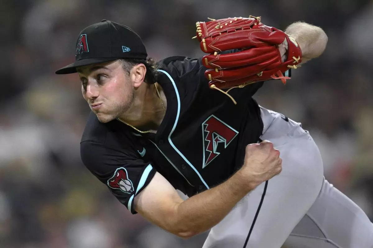 Arizona Diamondbacks starting pitcher Brandon Pfaadt works against a San Diego Padres batter during the eighth inning of a baseball game Wednesday, July 9, 2025, in San Diego. (AP Photo/Orlando Ramirez)
