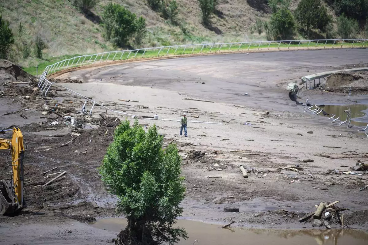 A man crosses the Ruidoso Downs Racetrack which was partially destroyed after the flood, Wednesday, July 9, 2025, in Ruidoso, N.M. (AP Photo/Roberto E. Rosales)