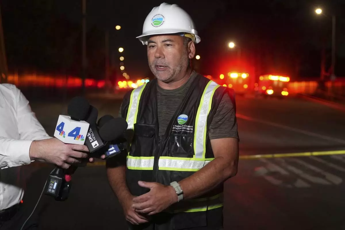 Los Angeles County Sanitation Districts Public Information Officer Michael Chee speaks to media after a tunnel collapsed on Wednesday, July 9, 2025, in Los Angeles. (AP Photo/Damian Dovarganes)