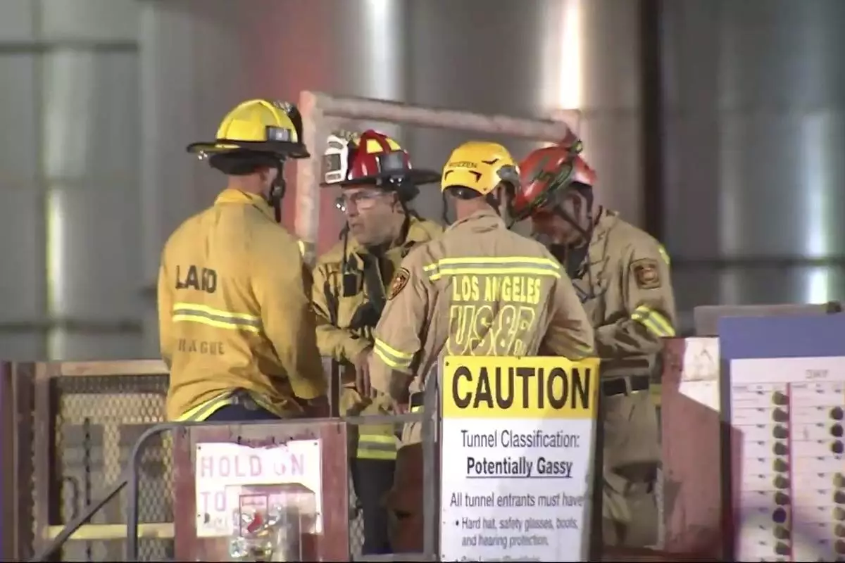 This image taken from footage provided by KABC/ABC7 Los Angeles shows first responders and rescued workers after a tunnel collapsed on Wednesday, July 9, 2025, in Los Angeles. (KABC/ABC7 Los Angeles via AP)