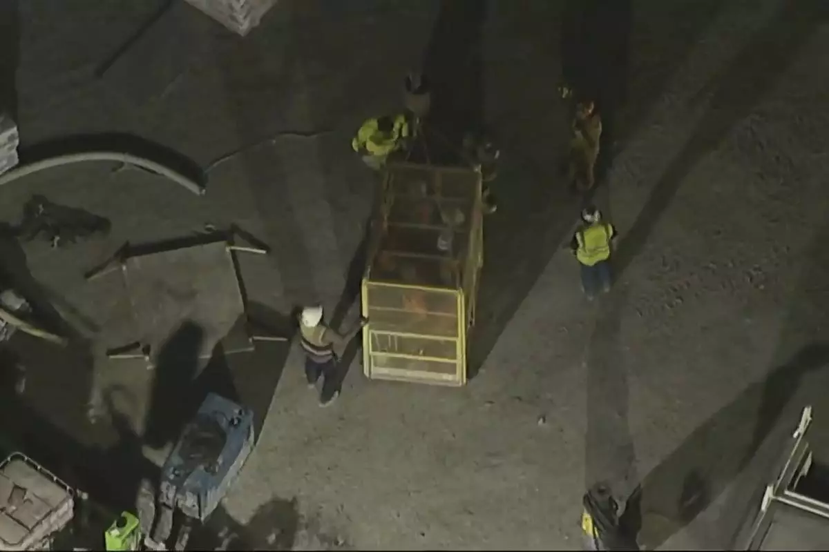 Aerial footage showed a crane hoisting workers out of the tunnel in a yellow cage.