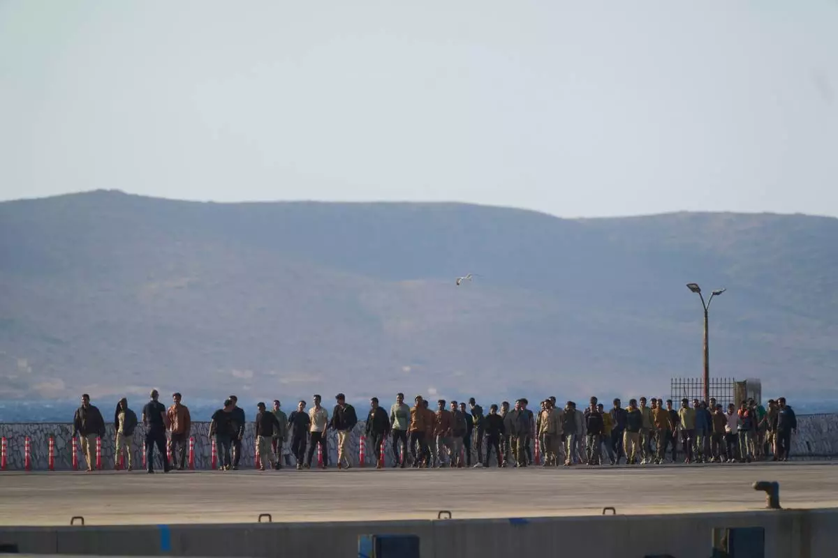 The migrants, consisting mostly of young men, were transferred overnight aboard a bulk carrier after their fishing trawler was intercepted by Greek authorities. Service vessels helped bring them ashore at the mainland port. They will be sent to detention facilities near the capital.