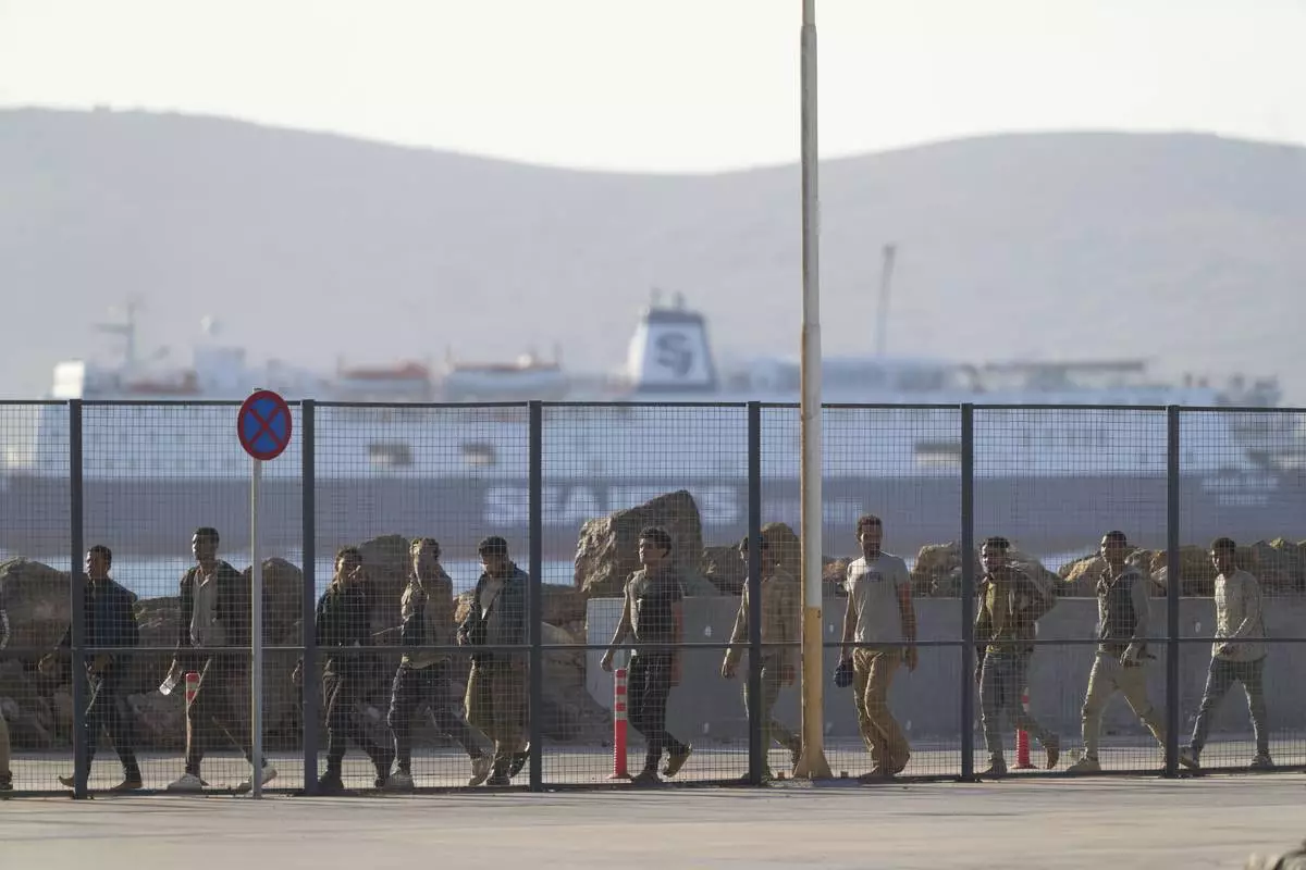 Migrants rescued south of Crete walk after their arrival at the the port of Lavrio, Greece, on Thursday, July 10, 2025. (AP Photo/Petros Giannakouris)