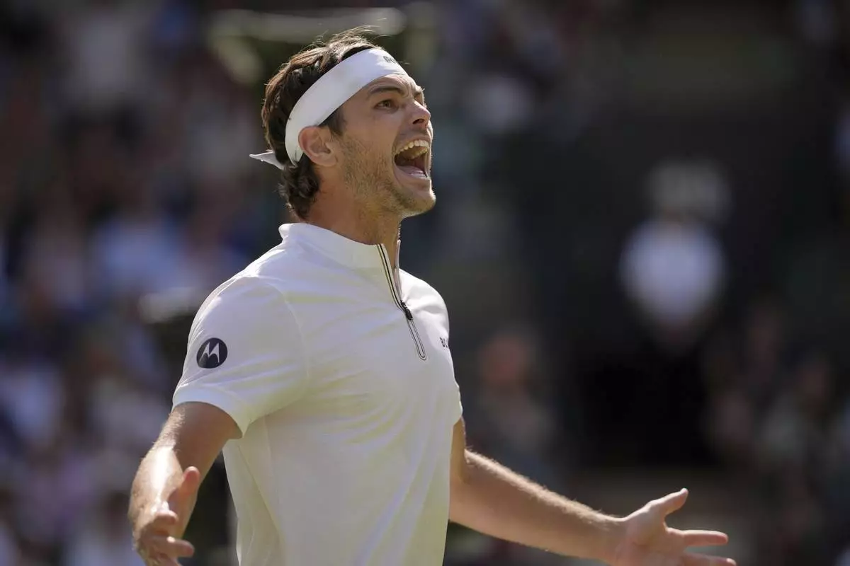 Taylor Fritz of the U.S. celebrates winning the men's singles quarter final match against Karen Khachanov of Russia at the Wimbledon Tennis Championships in London, Tuesday, July 8, 2025.(AP Photo/Kin Cheung)