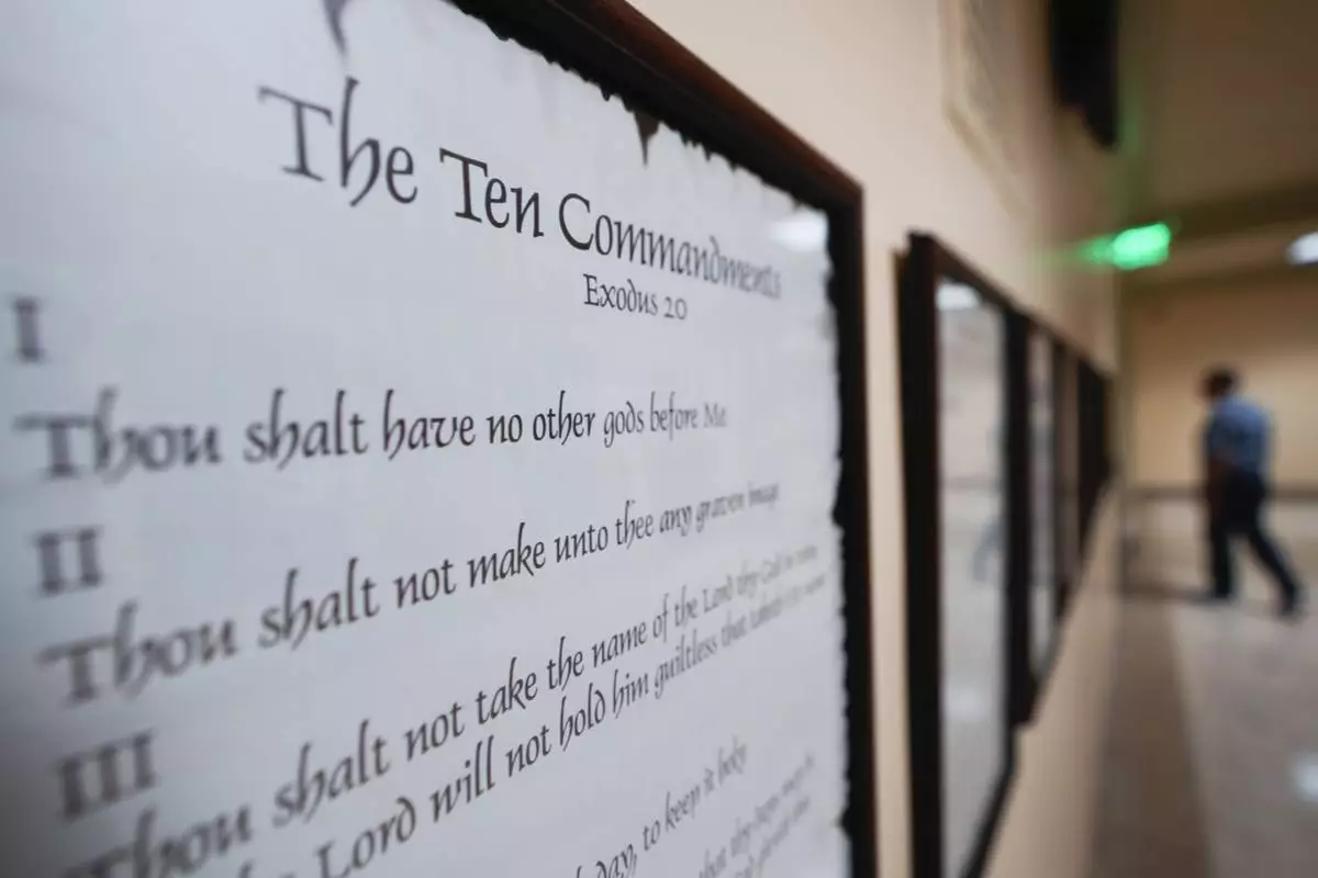 FILE - A copy of the Ten Commandments is posted along with other historical documents in a hallway at the Georgia Capitol on June 20, 2024, in Atlanta. (AP Photo/John Bazemore, File)