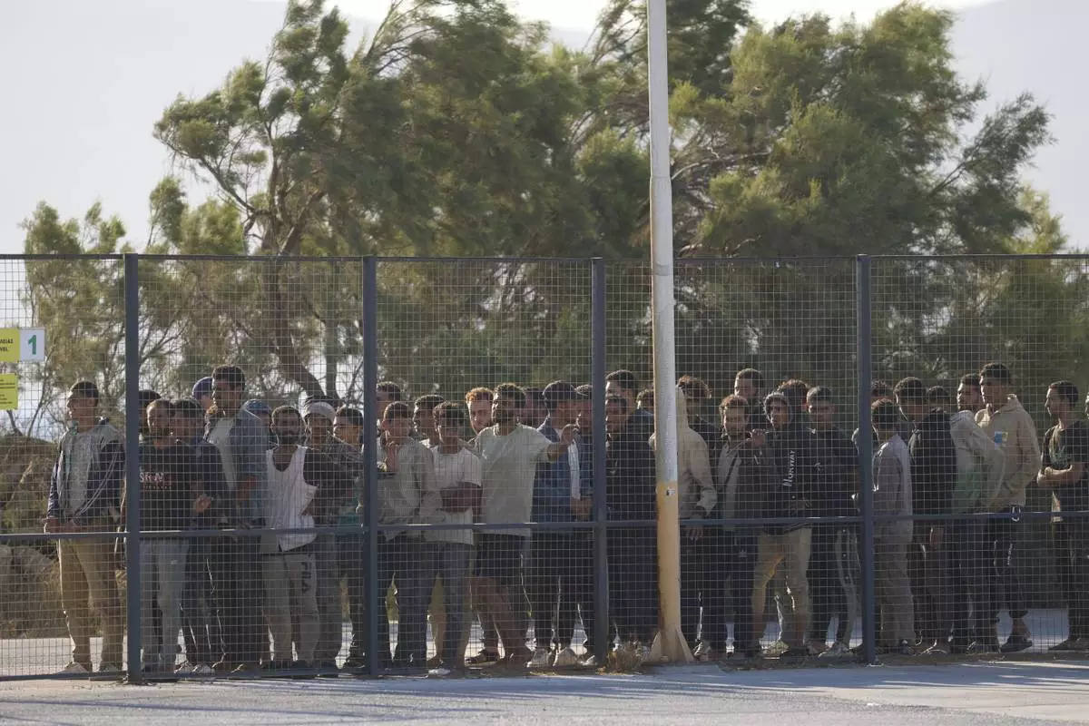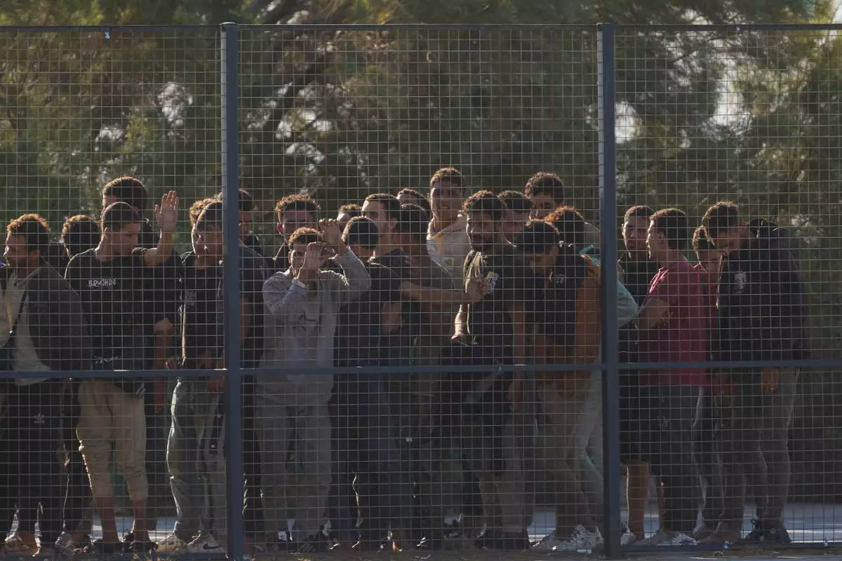 Migrants rescued south of Crete wait to be registered on their arrival at the the port of Lavrio, Greece, on Thursday, July 10, 2025. (AP Photo/Petros Giannakouris)