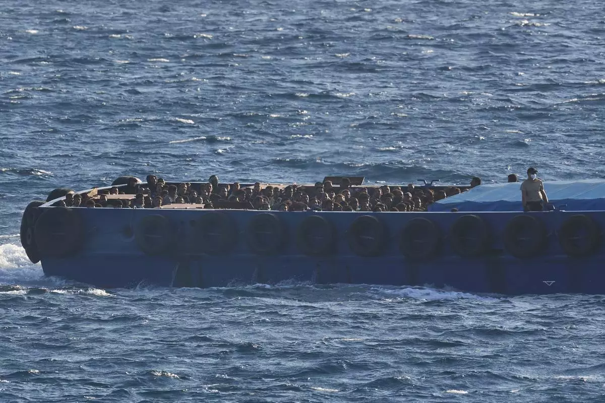 Migrants rescued south of Crete are transferred on a vessel to the port of Lavrio, Greece, on Thursday, July 10, 2025. (AP Photo/Petros Giannakouris)