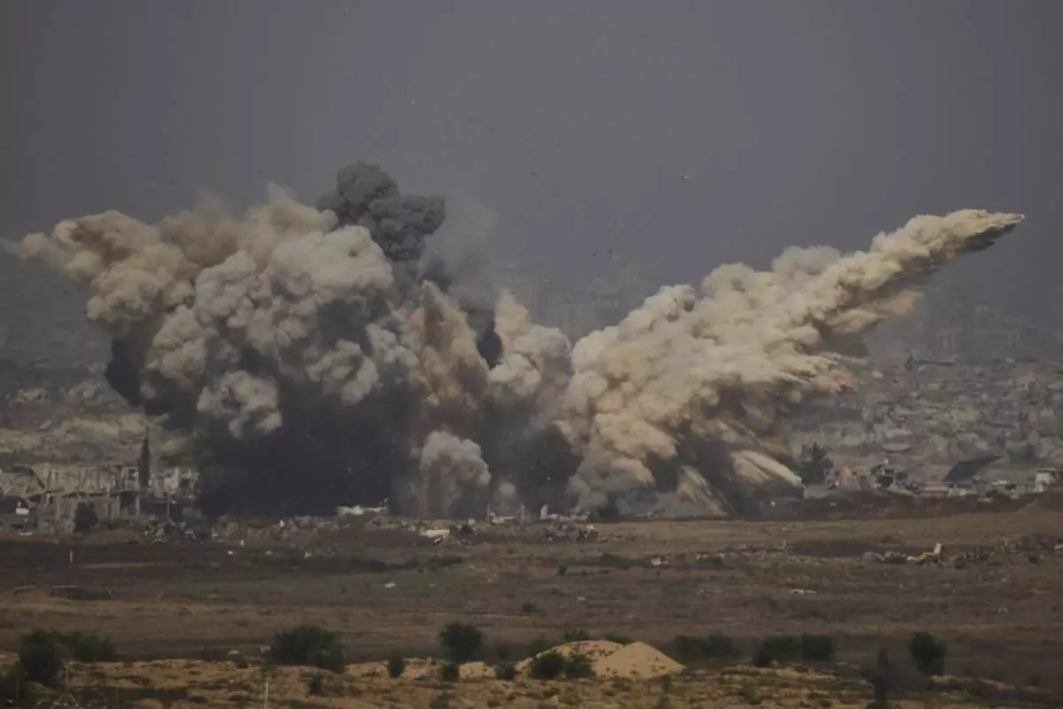 Smoke and fire rise to the sky following an Israeli army bombardment in the northern Gaza Strip, as seen from southern Israel, Thursday, July 10, 2025. (AP Photo/Leo Correa)