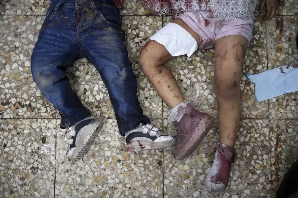 The bodies of two children lie on the hospital floor after an Israeli strike killed 10 people, including two women and five children, while they were waiting to receive nutritional supplements at a Project Hope-run medical clinic in Deir al-Balah, Gaza Strip, Thursday, July 10, 2025. (AP Photo/Abdel Kareem Hana)