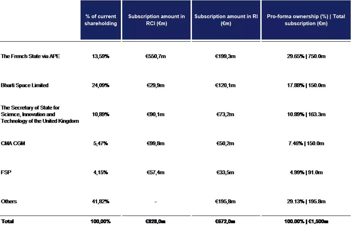 The Reserved Capital Increase would amount to €828 million, to be subscribed by the French State via APE for €551 million, Bharti Space Limited for €30 million, His Majesty’s Government for €90 million, CMA CGM for €100 million, and FSP for €57 million. The subsequent Rights Issue would amount to €672 million.
