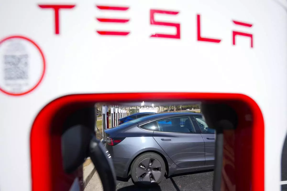 FILE - A Tesla level three Electric vehicle charger is visible, Feb. 2, 2024, in Kennesaw, Ga., near Atlanta. (AP Photo/Mike Stewart, File)
