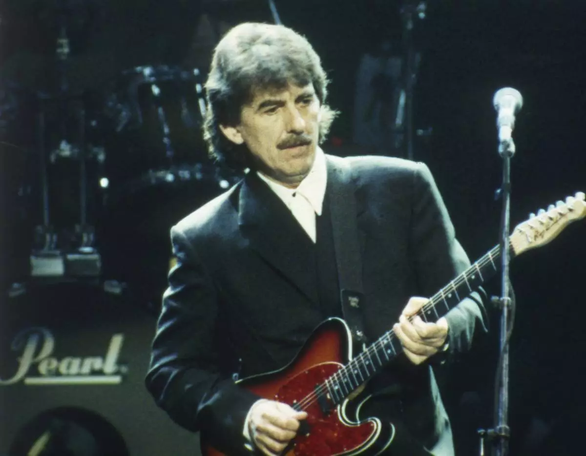 FILE - George Harrison performs at a concert in London on April 6, 1992. (AP Photo/Max Nash, File)