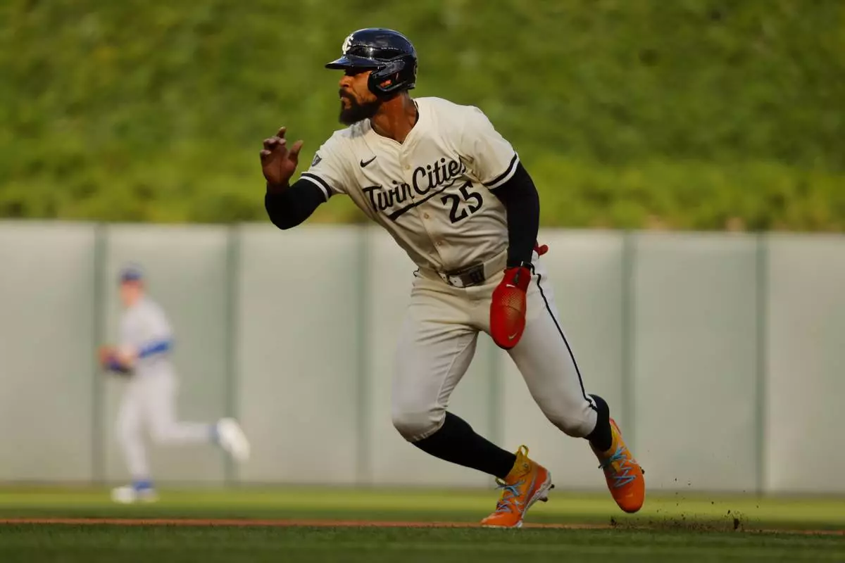 Minnesota Twins' Byron Buxton runs from second base and scores against the Chicago Cubs on a Ryan Jeffers double in the first inning of a baseball game Tuesday, July 8, 2025, in Minneapolis. (AP Photo/Bruce Kluckhohn)