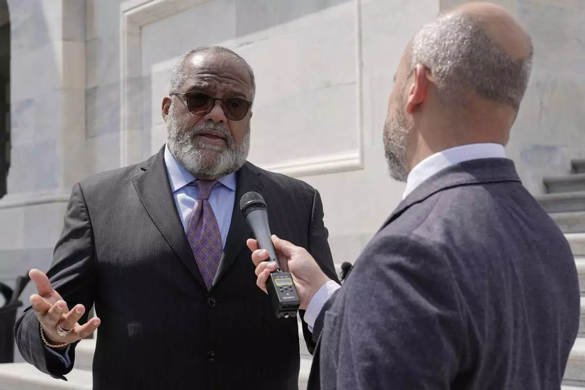 Rep. Troy Carter, D-La., left, speaks with reporters outside of the U.S. Capitol, Wednesday, July 2, 2025, in Washington. (AP Photo/Mariam Zuhaib)