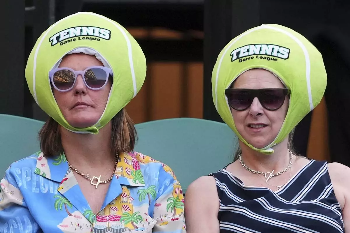 Members in the crowd wear a tennis ball hat as they watch Joe Salisbury of Britain and Luisa Stefani of Brazil during the mixed doubles final match against Sem Verbeek of Netherland and Katerina Siniakova of Czech Republic at the Wimbledon Tennis Championships in London, Thursday, July 10, 2025.(AP Photo/Kirsty Wigglesworth)