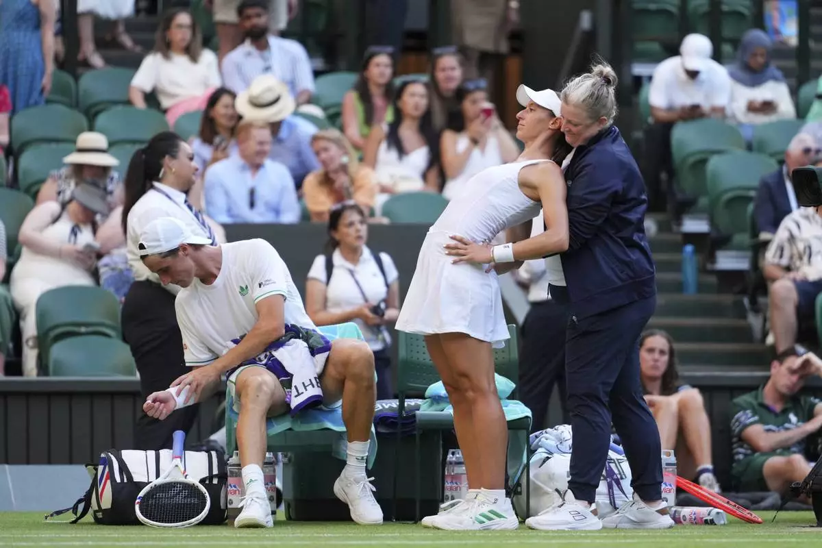 Joe Salisbury of Britain watches as Luisa Stefani of Brazil gets medical assistance during the mixed doubles final match against Sem Verbeek of Netherland and Katerina Siniakova of Czech Republic at the Wimbledon Tennis Championships in London, Thursday, July 10, 2025.(AP Photo/Kirsty Wigglesworth)