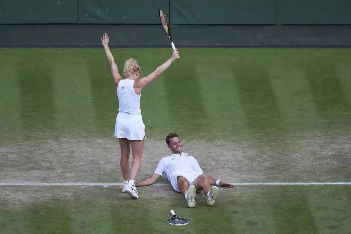 Sem Verbeek of the Netherlands and Katerina Siniakova of Czech Republic celebrate winning the mixed doubles final match against Joe Salisbury of Britain and Luisa Stefani of Brazil at the Wimbledon Tennis Championships in London, Thursday, July 10, 2025.(AP Photo/Kirsty Wigglesworth)