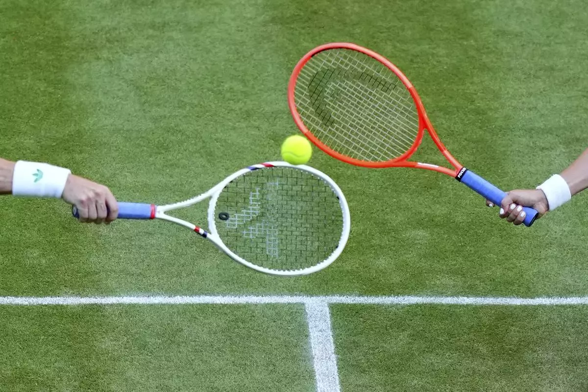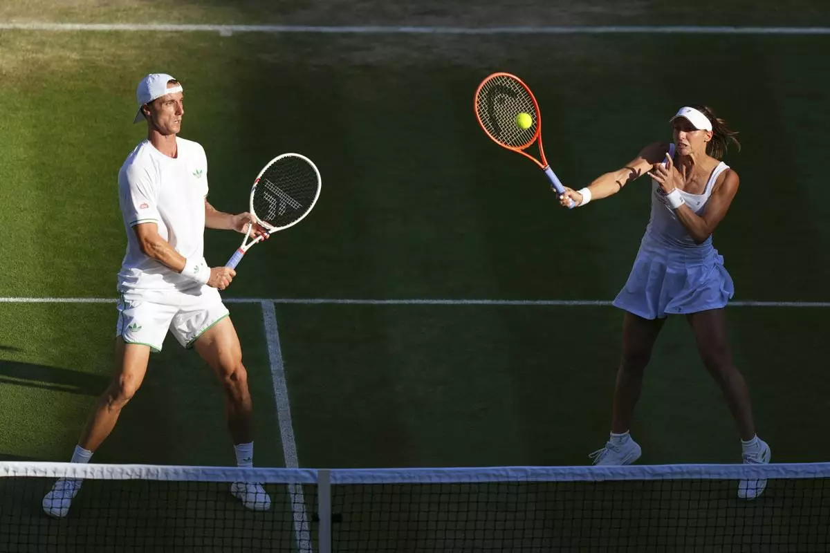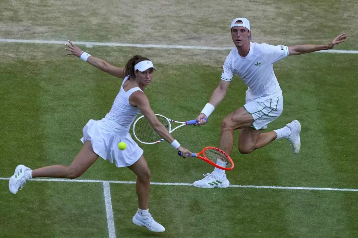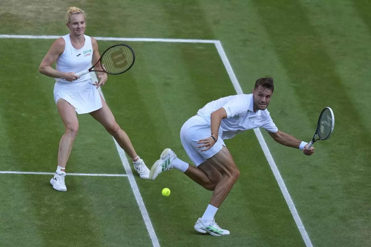 Katerina Siniakova of Czech Republic returns as Sem Verbeek of the Netherlands watches during the mixed doubles final match against Joe Salisbury of Britain and Luisa Stefani of Brazil at the Wimbledon Tennis Championships in London, Thursday, July 10, 2025.(AP Photo/Kirsty Wigglesworth)