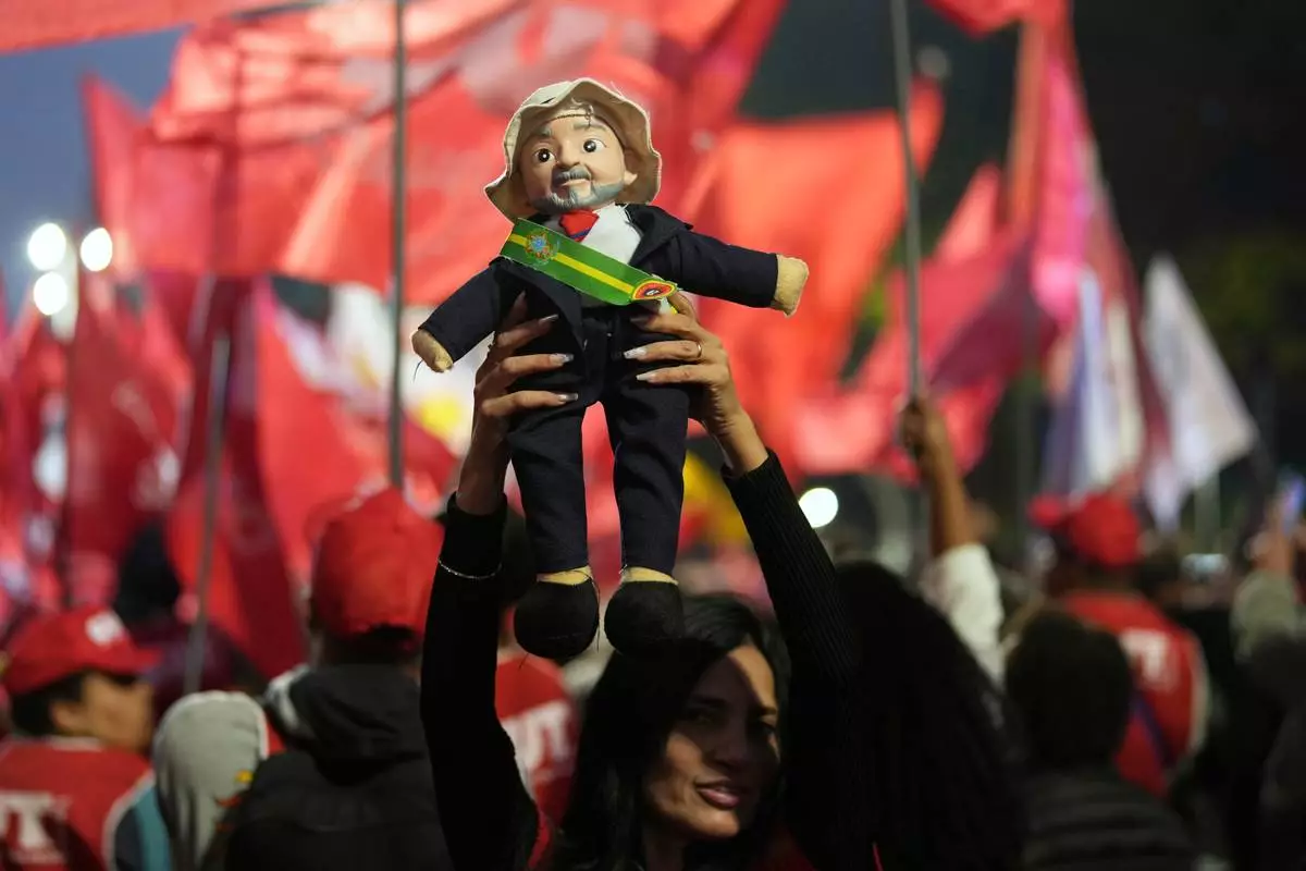 Protesters hold up a doll of Brazilian President Lula Inacio Lula da Silva during a protest against U.S. President Donald Trump's announcement of 50% tariffs on Brazilian goods, in Sao Paulo, Thursday, July 10, 2025. (AP Photo/Andre Penner)