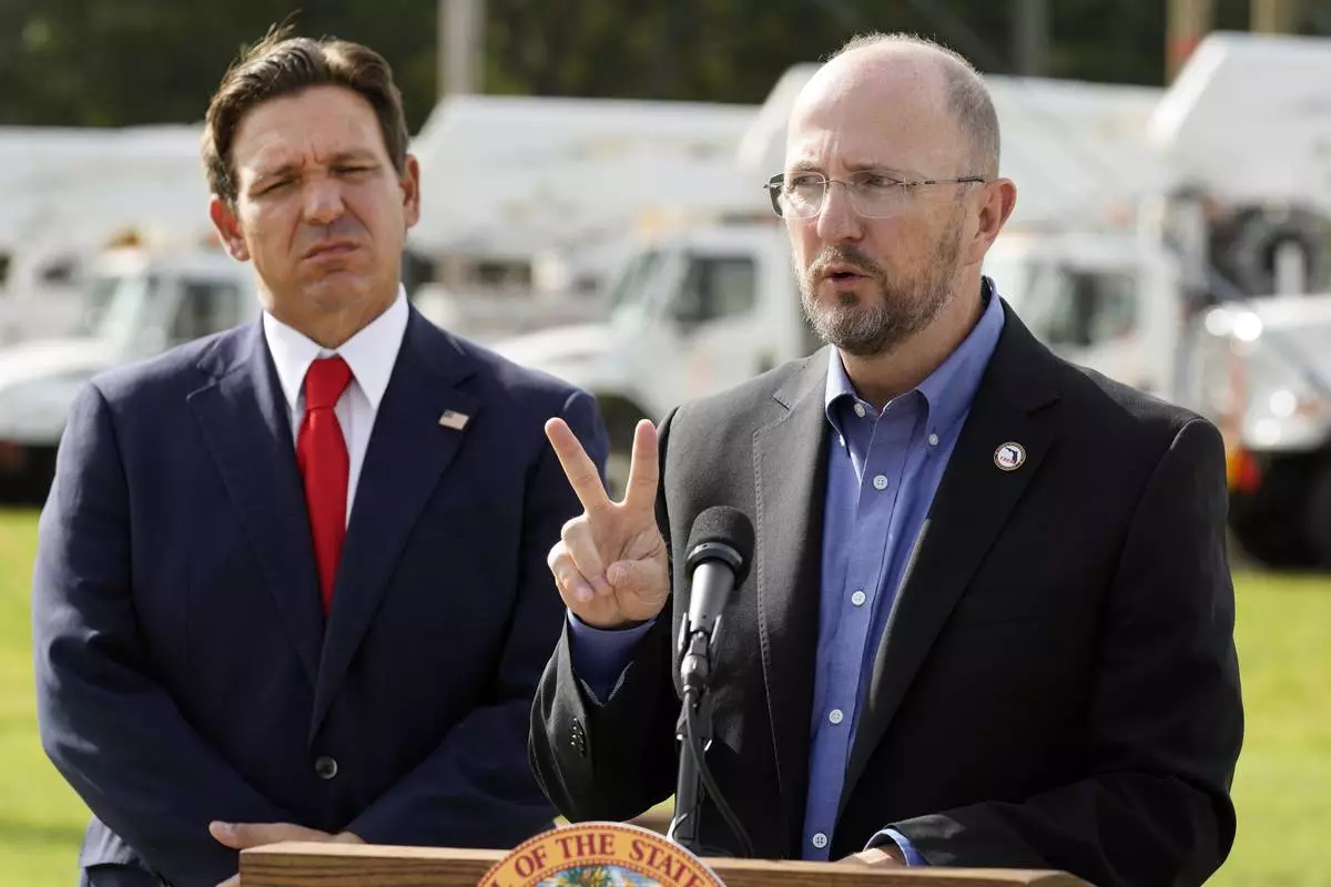 FILE - Kevin Guthrie, director of Florida Division of Emergency Management, right, gestures as Florida Gov. Ron DeSantis looks on during a news conference, Sept. 25, 2024, at the Tampa Electric Company offices in Tampa, Fla. (AP Photo/Chris O'Meara, File)