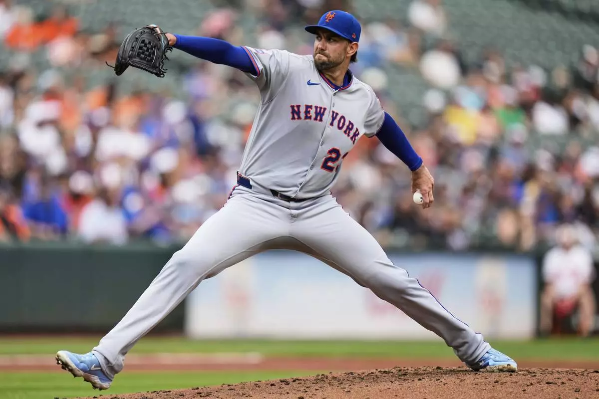 New York Mets starting pitcher David Peterson delivers during the second inning in the first baseball game of a doubleheader against the Baltimore Orioles, Thursday, July 10, 2025, in Baltimore. (AP Photo/Stephanie Scarbrough)