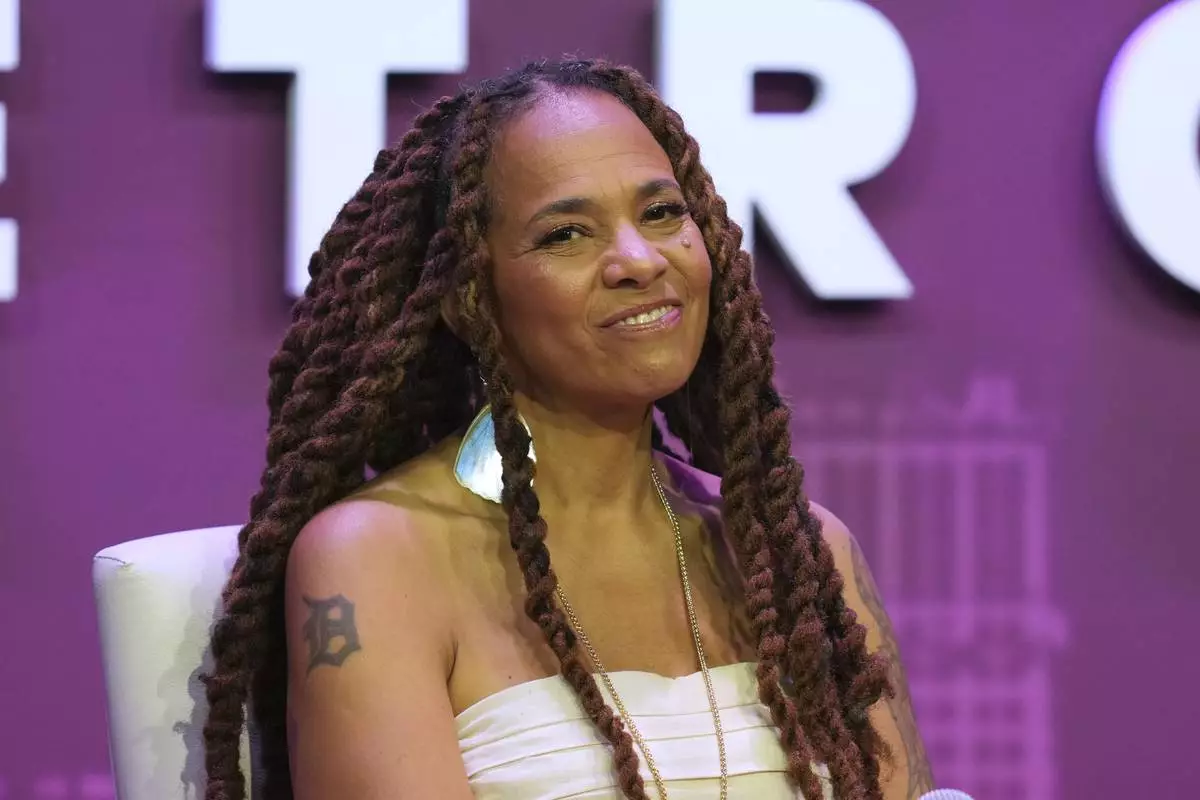 Jessica Care Moore, Detroit Poet Laureate, speaks at a Global Citizen NOW event in Detroit, Thursday, July 10, 2025. (AP Photo/Paul Sancya)