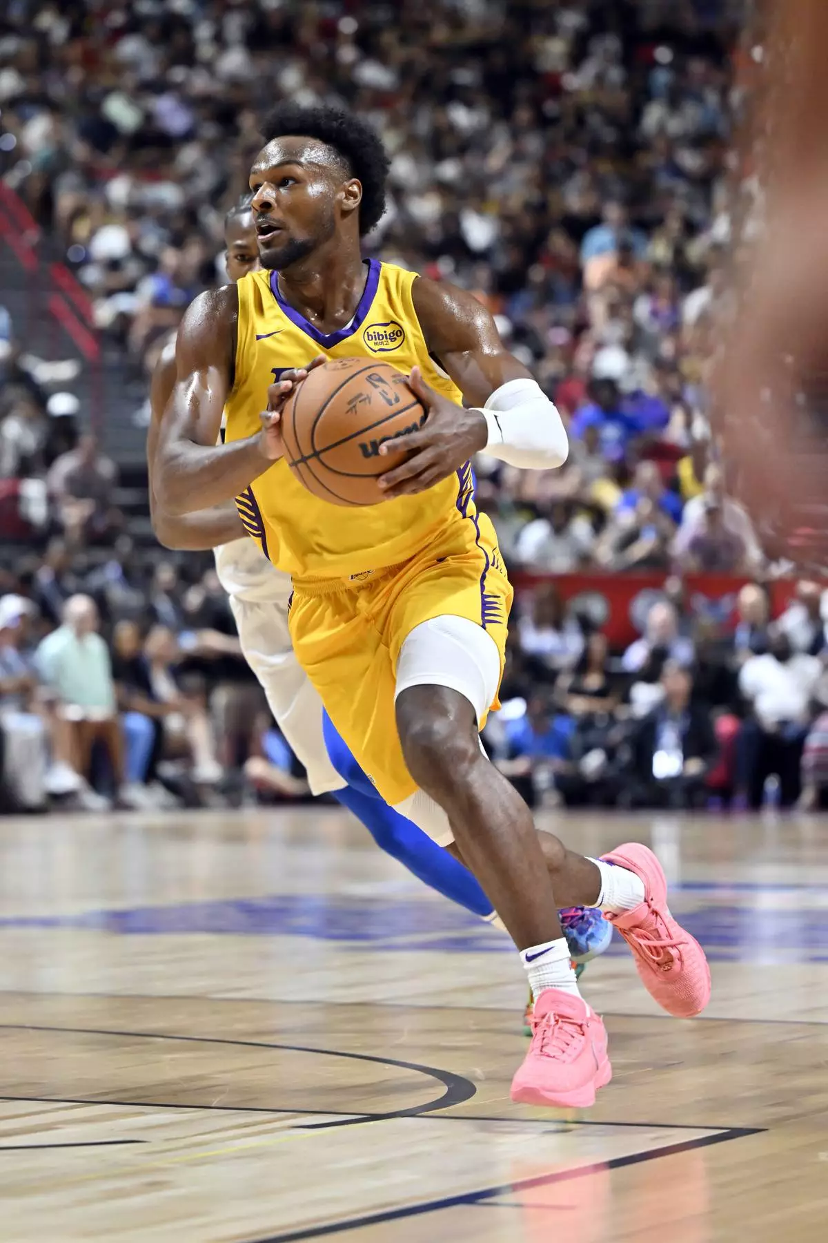 Los Angeles Lakers guard Bronny James (9) looks on during the first half of an NBA summer league basketball game against the Dallas Mavericks, Thursday, July 10, 2025, in Las Vegas. (AP Photo/David Becker)