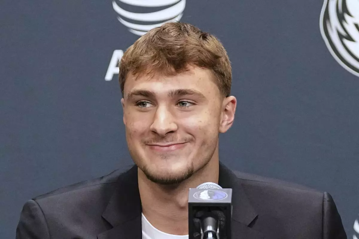 Dallas Mavericks' Cooper Flagg, the No. 1 overall pick in the NBA draft, takes questions during an NBA basketball press conference at the team's practice facility, Friday, June 27, 2025, in Dallas. (AP Photo/Tony Gutierrez)
