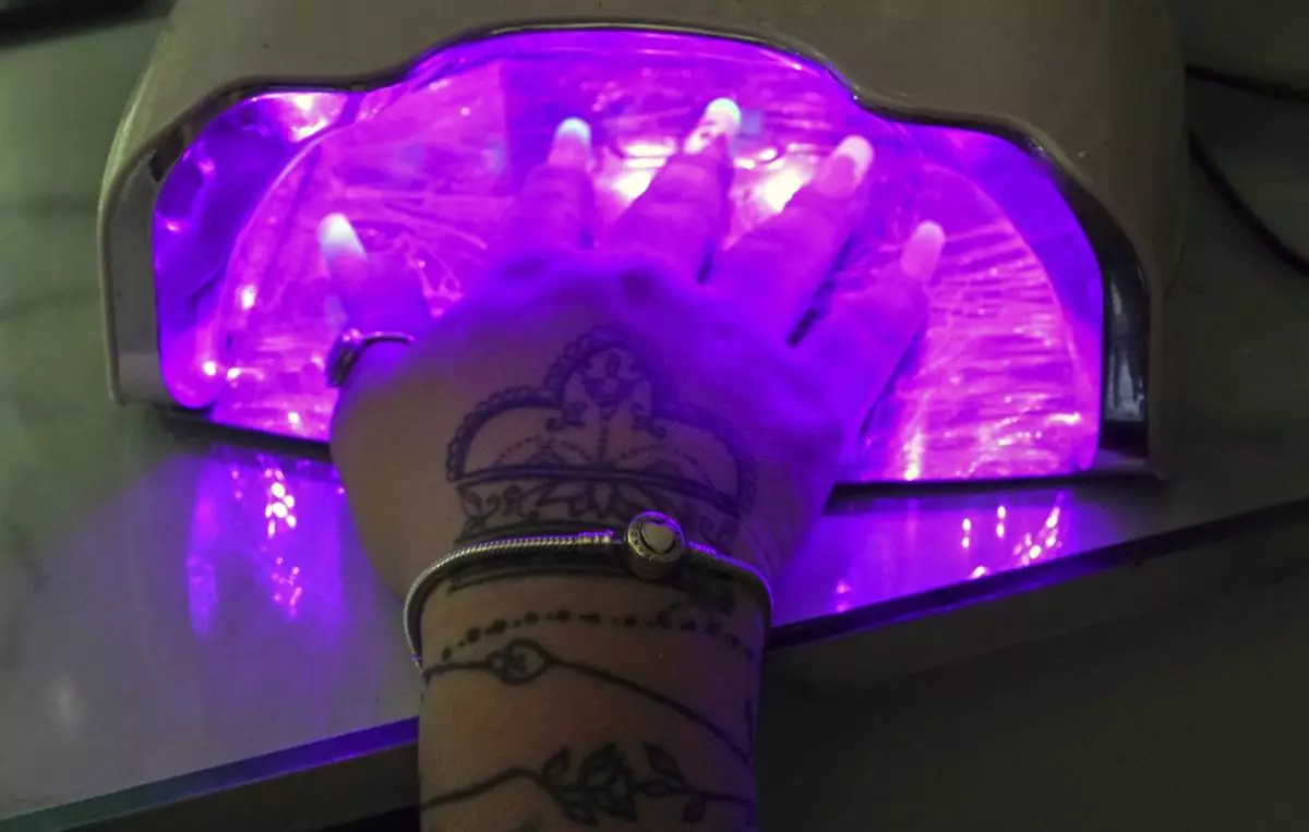 Mariam Camila Sosa places her hand under a UV lamp to speed dry her manicured nails at a home-run nail salon, in Havana, Cuba, Tuesday, June 24, 2025. (AP Photo/Ramon Espinosa)