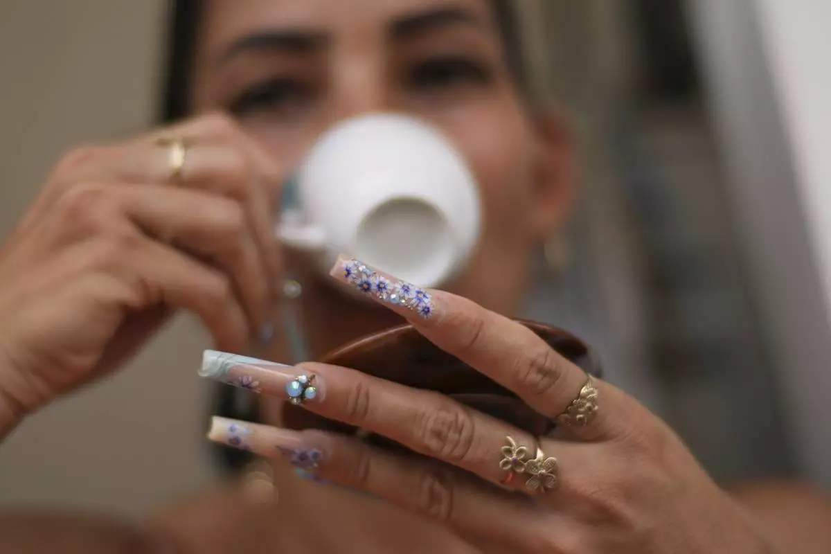 Yalema Gonzalez, wearing long, decorative nails, drinks her afternoon coffee at her home in La Gallega, Havana province, Cuba, Saturday, June 28, 2025. (AP Photo/Ramon Espinosa)