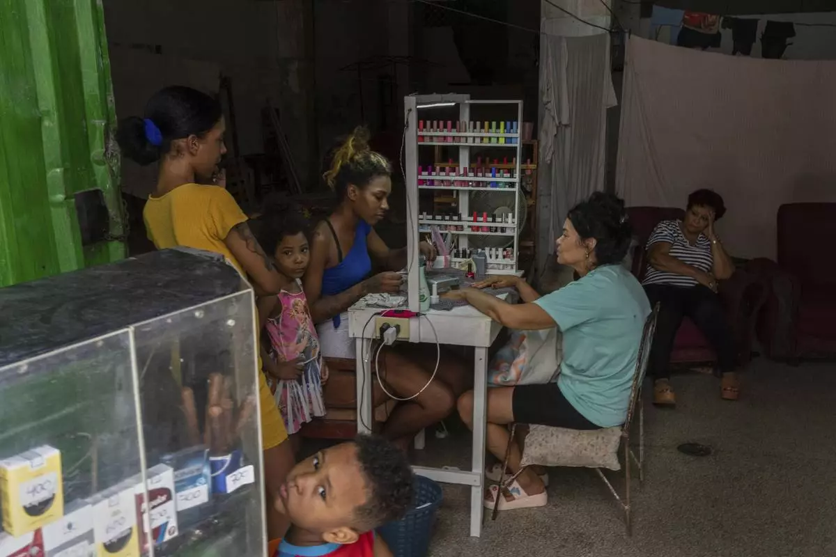 A manicurist works on a client's nails as others wait at a home-run nail salon in Havana, Cuba, Monday, July 7, 2025. (AP Photo/Ramon Espinosa)