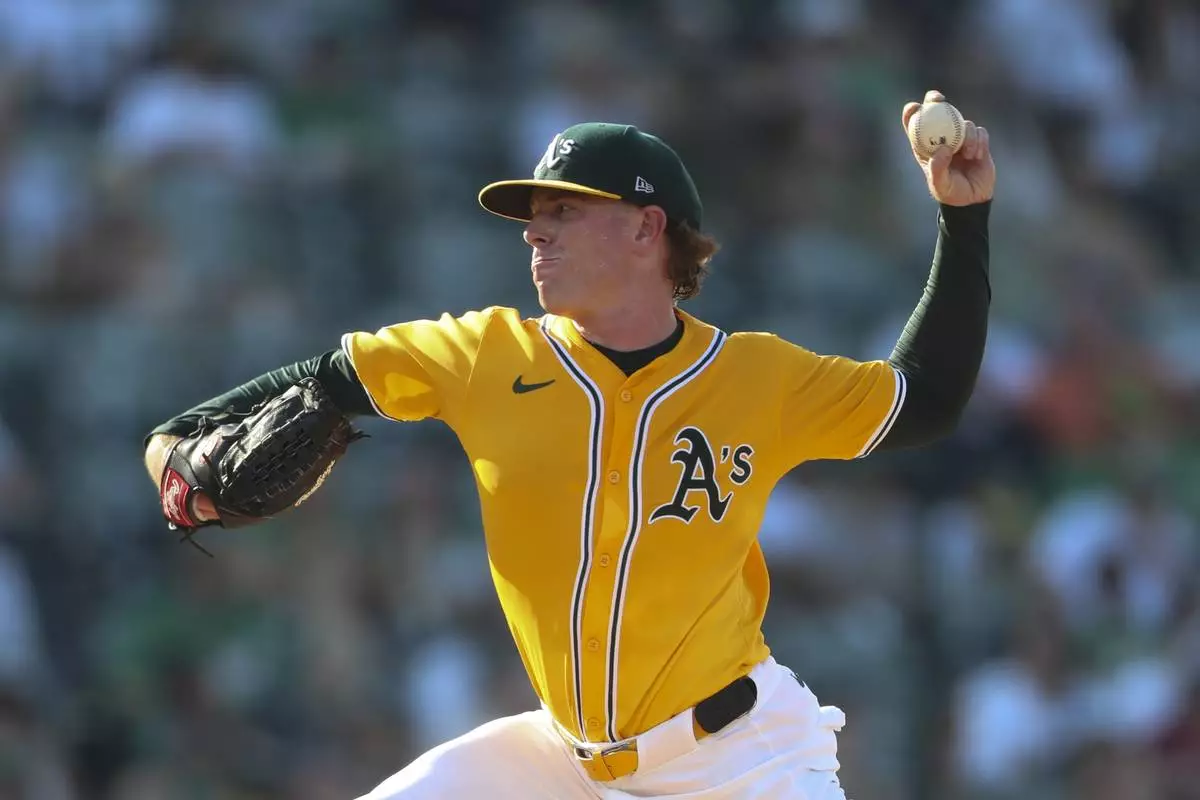 Athletics pitcher JP Sears throws to an Atlanta Braves batter during the first inning of a baseball game Thursday, July 10, 2025, in West Sacramento, Calif. (AP Photo/Scott Marshall)