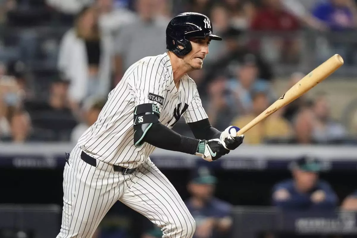 New York Yankees' Cody Bellinger hits a single during the ninth inning of a baseball game against the Seattle Mariners, Thursday, July 10, 2025, in New York. (AP Photo/Yuki Iwamura)
