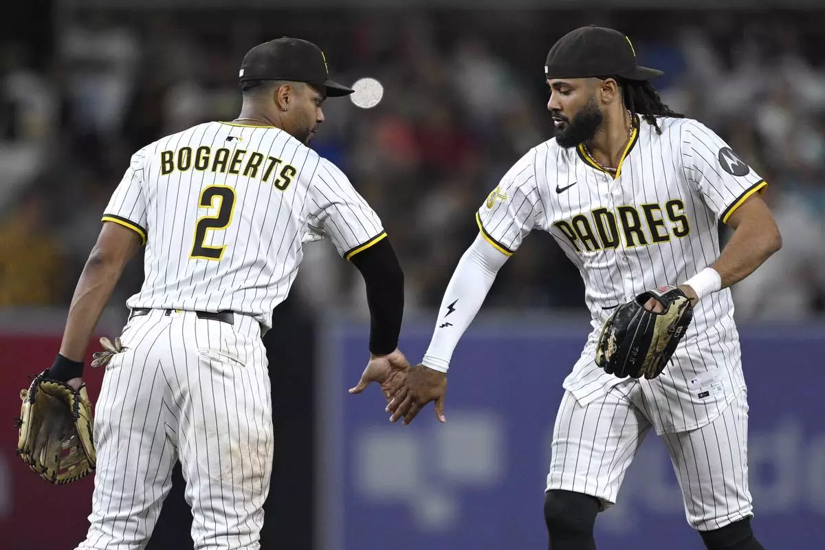 San Diego Padres' Xander Bogaerts (2) and Fernando Tatis Jr. celebrate on the field after defeating the Arizona Diamondbacks in a baseball game Thursday, July 10, 2025, in San Diego. (AP Photo/Orlando Ramirez)