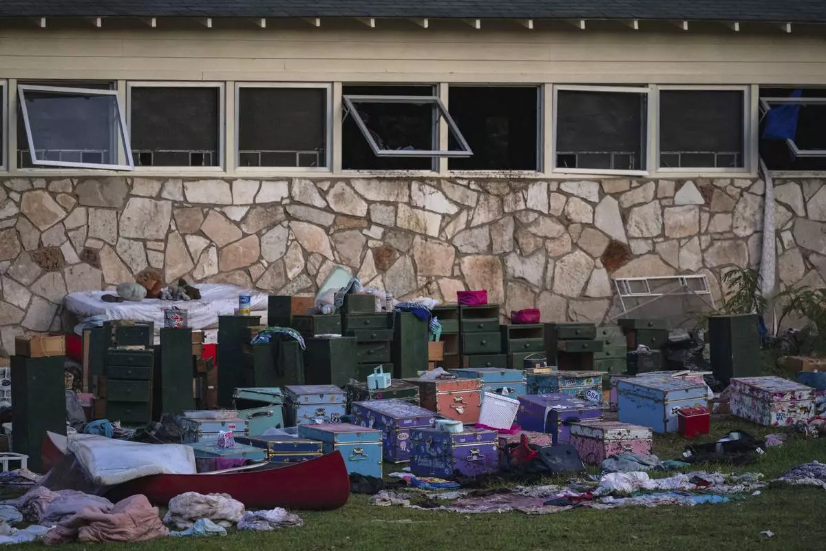 The belongings of campers sit outside one of Camp Mystic's cabins near the Guadalupe River in Hunt, Texas, on Monday, July 7, 2025, after a deadly flash flood swept through the area. (AP Photo/Eli Hartman)